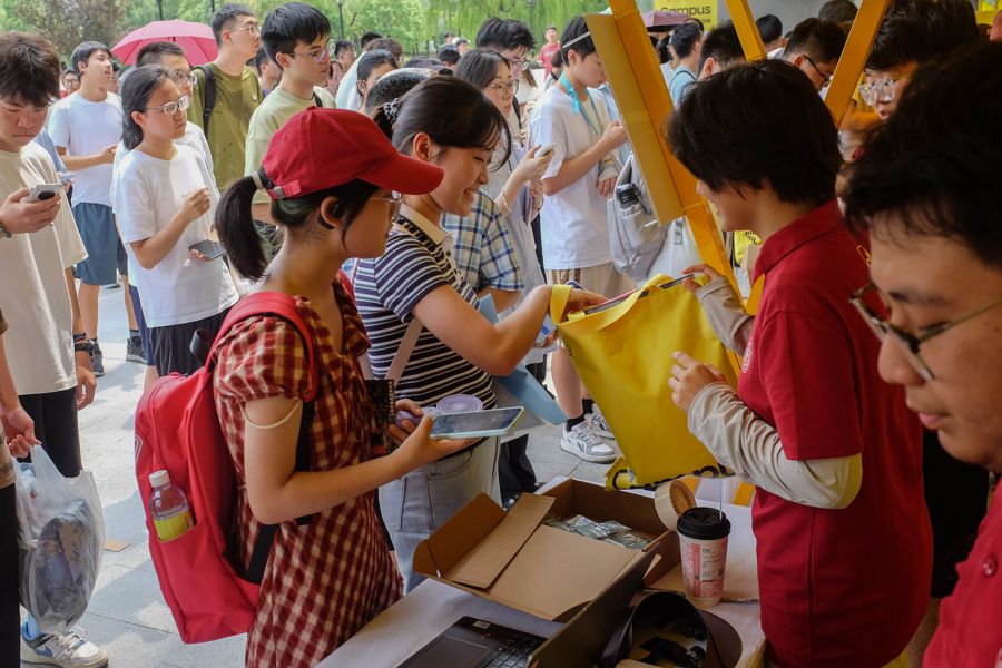 新生在排队等候领取新生大礼包。