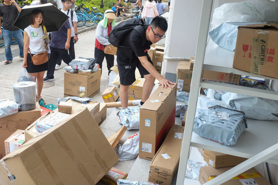 新生在收取快递。