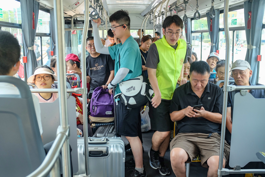 新生和家长乘坐校园巴士前往宿舍楼。
