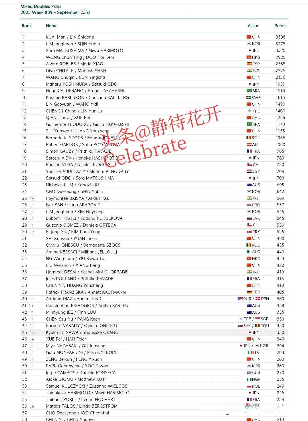 近期在国际比赛也有不俗表现的王曼昱目前积8250分稳居第二,陈幸同6075分排名第三,蒯曼4955分保持第四,王艺迪4150分排在第五,