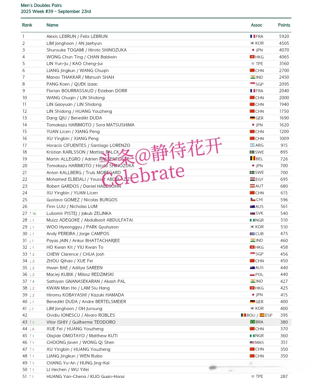 法国小将费利克斯·勒布伦3220分保持第七,德国选手杜达2925分排在第八,国乒选手向鹏2405分排名第九,斯洛文尼亚选手达科2400分保持第10。