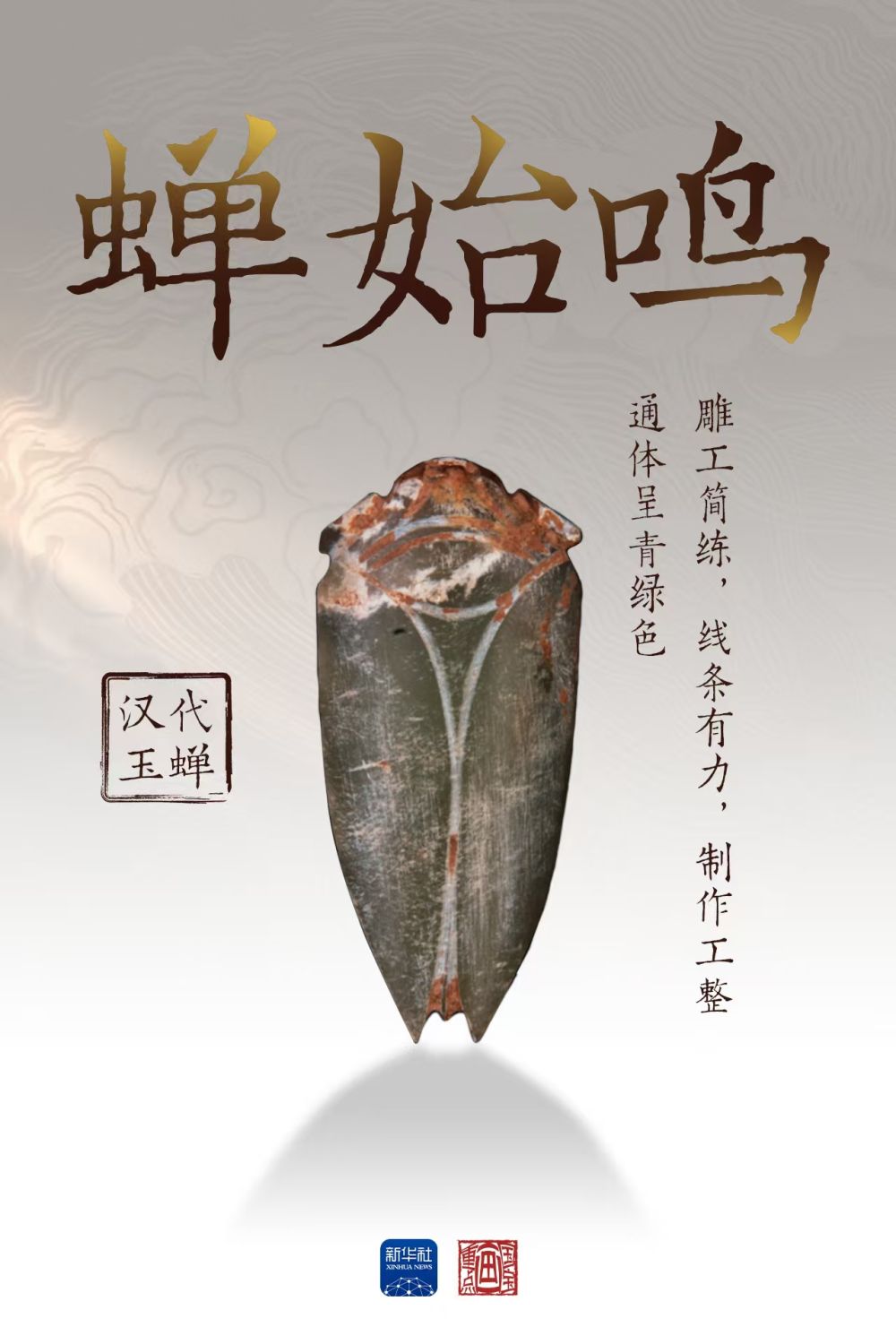 这件汉代玉蝉通体呈青绿色,盛夏的气息扑面而来。《礼记·月令》记载:“仲夏之月,蝉始鸣”,古人发现夏至之日阳气达到极盛,蛰伏地底多年的蝉若虫会破土羽化宣告盛夏来临,这是自然界的昆虫“节气预报”。