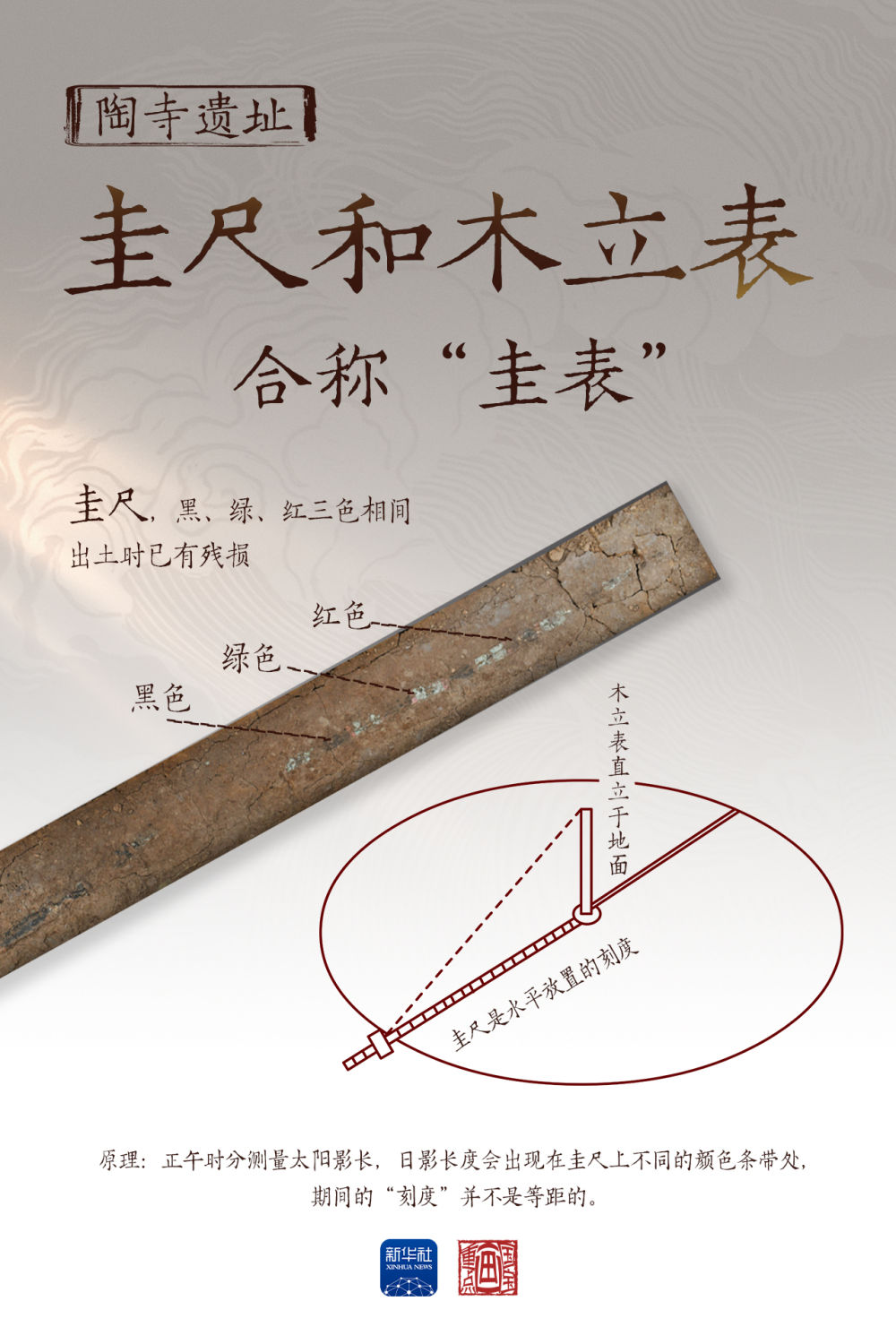 圭尺和木立表,是陶寺遗址出土的另外一件观天象、授人时的文物,合称“圭表”。木立表直立于地面,圭尺是水平放置的刻度。圭表测量太阳影长,与观象台相辅相成,用于太阳历法的制定。黑、绿、红三色相间的漆木杆“圭尺”,出土时已有残损,残长171.8厘米,复原长度187.5厘米。正午时刻,太阳照在木立表上,投下的影子被圭尺上的刻度标记出长短。在夏至、春分和秋分,日影长度会出现在圭尺上不同的颜色条带处,期间的“刻度”并不是等距的。