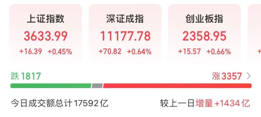 截至今天收盘,上证指数上涨0.45%,报3633.99点,创今年以来收盘新高;深证成指上涨0.64%,创业板指上涨0.66%。全市场成交额17592亿元,较前一交易日放量1434亿元。板块方面,PEEK材料、军工、人形机器人、光刻机等板块涨幅居前,创新药、旅游等板块跌幅居前。