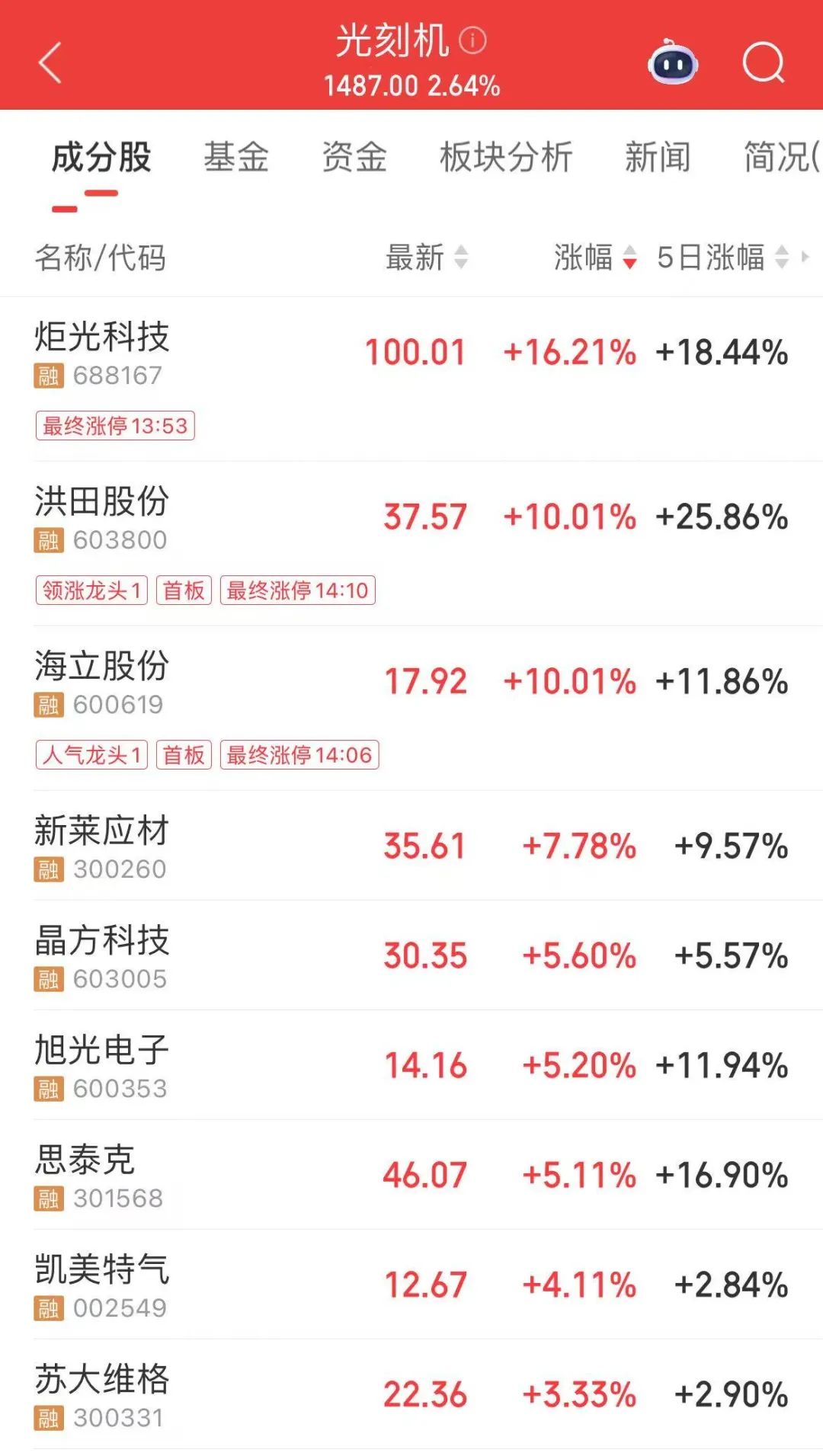芯片股午后拉升,光刻机方向领涨,炬光科技涨超16%。